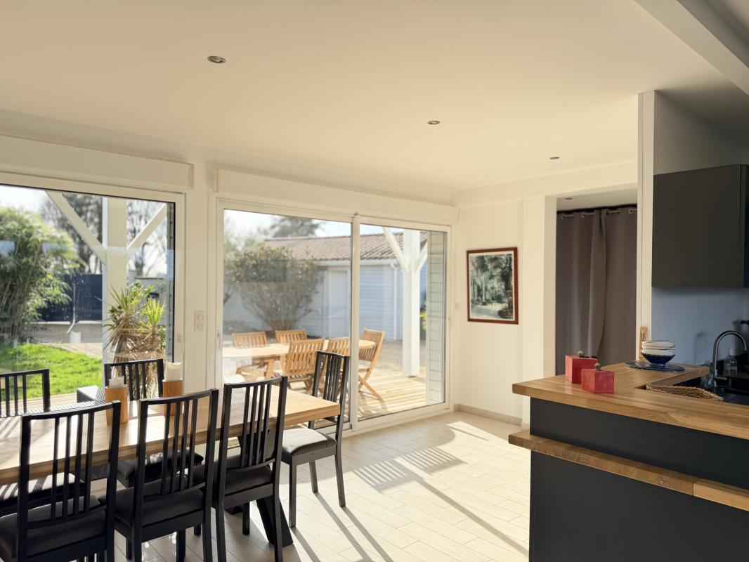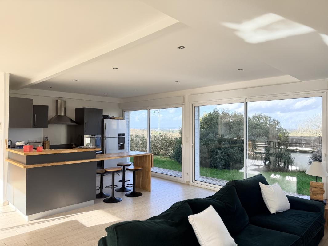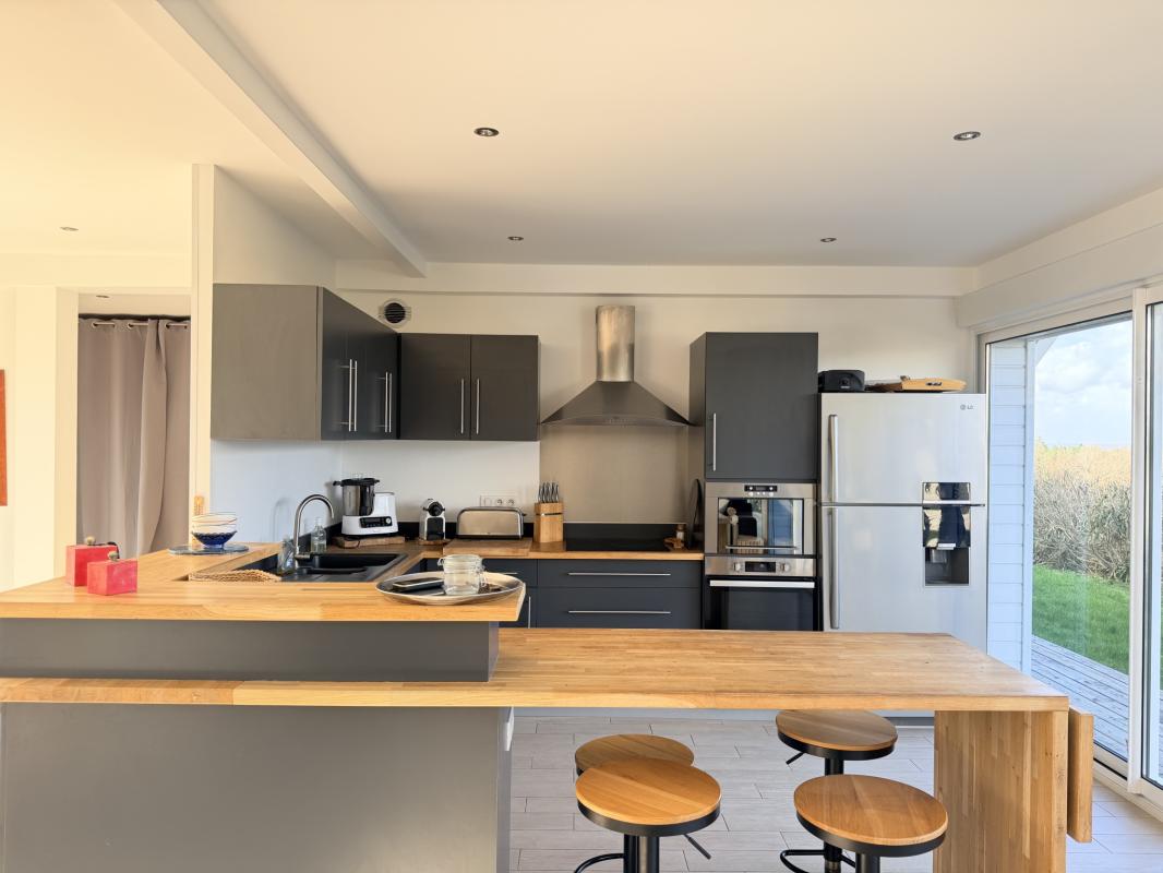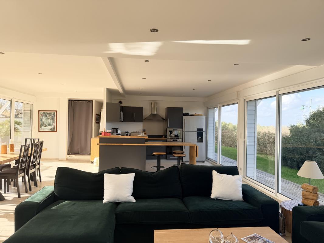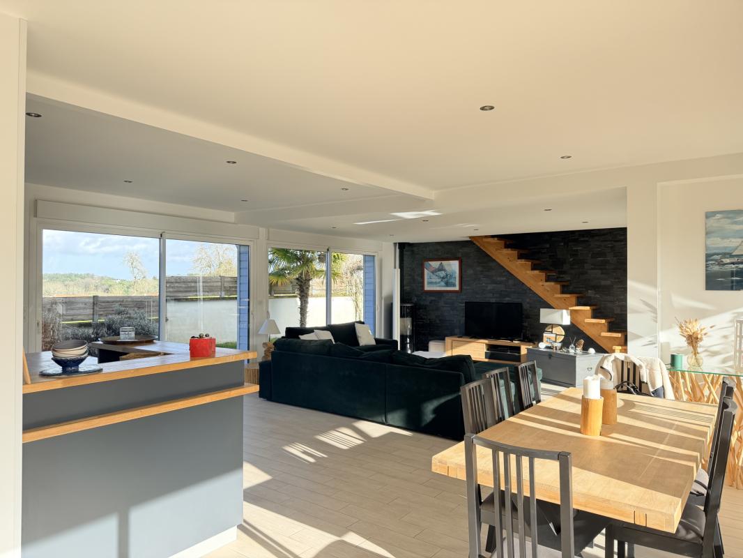 La maison dispose d’une vaste pièce de vie traversante de 62 m2, baignée de lumière grâce à ses grandes ouvertures et offrant un accès direct à la terrasse et au jardin. La cuisine ouverte est moderne, fonctionnelle et parfaitement intégrée à l’espace de vie.