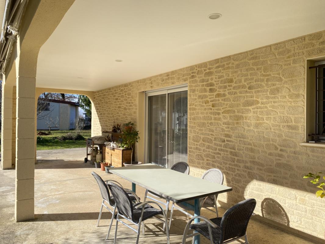 Terrasse d’environ 150 m2 tout autour de la maison, dont 30 m2 couverts, avec un prolongement équipé de deux stores banne.