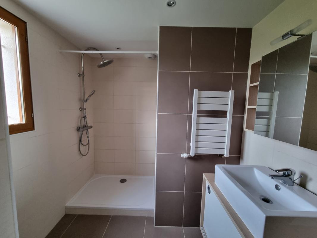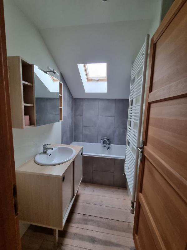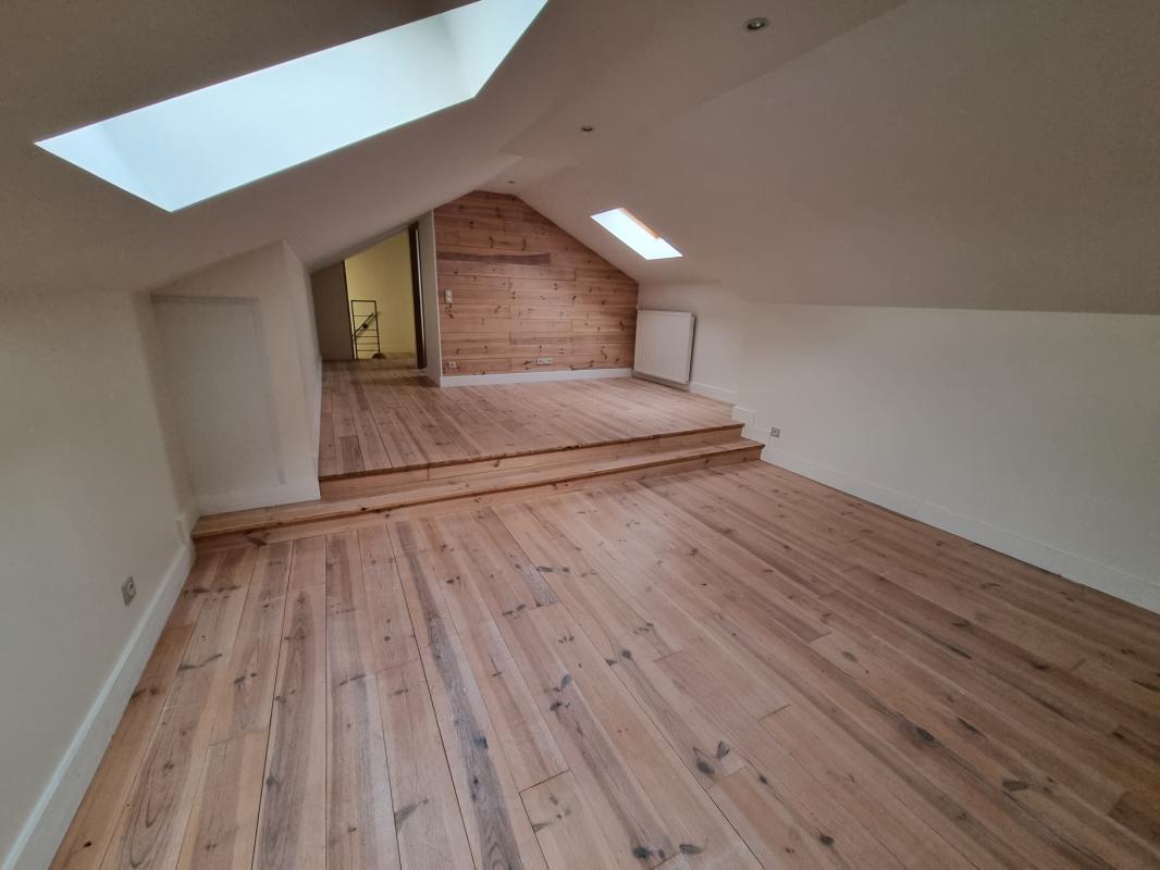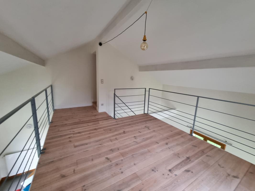 Au premier étage, nous avons 66.5m2 de surface utile dont 48.50m2 sont habitable. L’étage se compose d’une grande mezzanine de 15m2, d’une salle de jeux ou coin bureau de 19m2, la troisième chambre et une salle de bain avec WC.